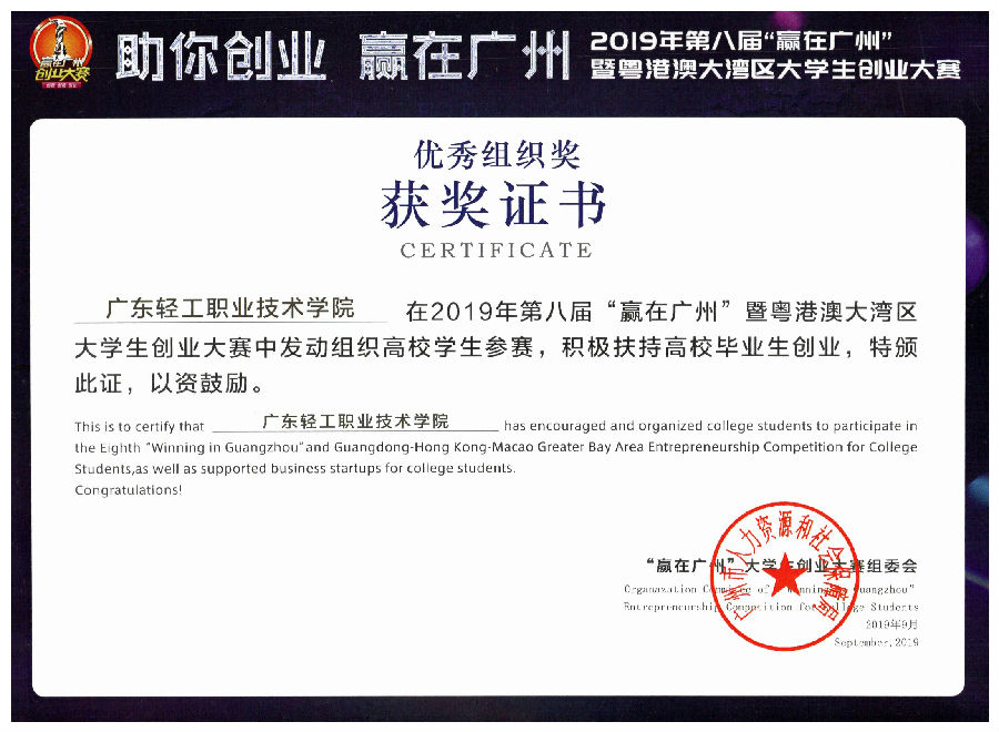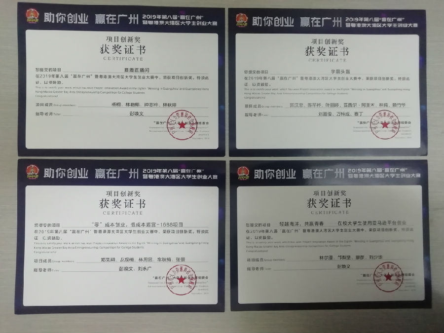 2019年3月22日至9月20日,由广州市人力资源和社会保障局主办,中国南方人オ市场管理委员会办公室承办的2019年第八届“赢在广州”暨粤港澳大湾区大学生创业大赛成功举办。我校积极组织参赛,荣获了组织优秀奖。同时,我校《“零”成本创业,低成本运营—1688项目》、《轻越海洋,共赢青春一一在校大学生使用亚马逊平台创业》、《学霸头盔》、《麋鹿直播间》4个项目获得创新奖。