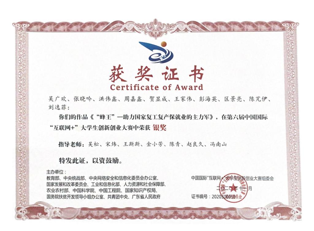 吴广欢校友在读期间曾作为“蜂王”项目负责人,“蜂王”项目也在第六届中国国际“互联网+”大学生创新创业大赛荣获银奖。从创业至今短短数年,吴广欢旗下已经拥有佛山蜂王人力资源有限公司等十多家企业,“蜂王”也成为佛山市重点扶持企业。